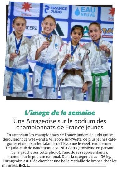 En attendant les championnats de France juniors de judo qui se dérouleront ce week-end à Villebon-sur-Yvette, de plus jeunes catégories étaient sur les tatamis de l’Essonne le week-end dernier. Le Judo Club de Baudimont a vu Nila Aerts (troisième en partant de la gauche sur cette photo), l’une de ses représentantes, monter sur le podium national. Dans la catégorie des – 36 kilos, l’Arrageoise est allée chercher une belle médaille de bronze chez les minimes.